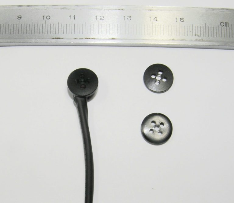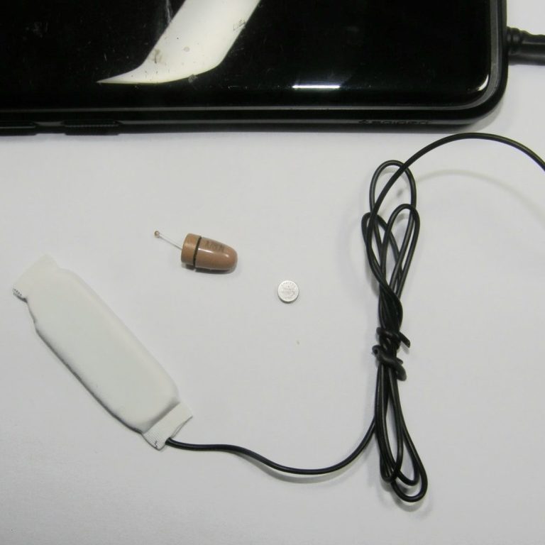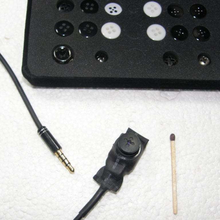 Fotos: AHD 1080p Minikamera und drahtloser Ohrhörer mit Induktionspad. Das nur 2 mm dicke Pad wird am Oberkörper getragen. Rechts unten : Bluetooth MiniOhrhörer für direkte Verbindung Smartphone